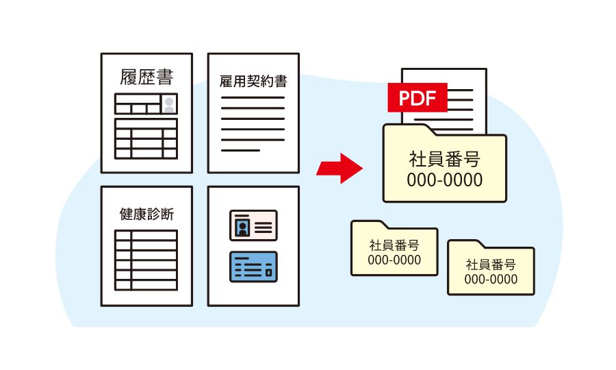 履歴書、雇用契約書、誓約書などをPDFで受け取り、結合し、管理・保存。
