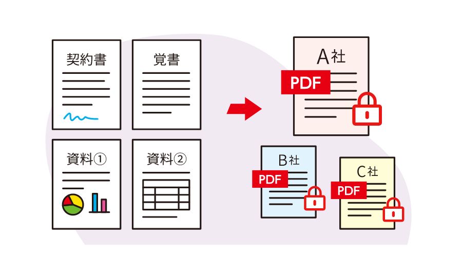 契約書、覚書、添付資料などを結合して、取引先ごとの「契約書セット」を作成。