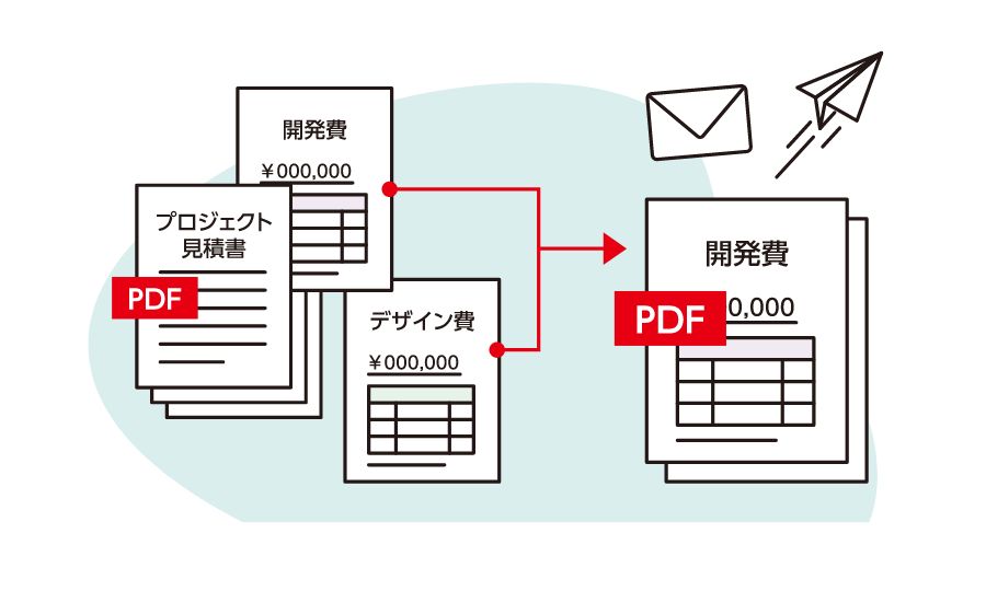別々に作成した提案資料・製品資料・見積書を結合し、メール添付や共有リンクで顧客に送付。