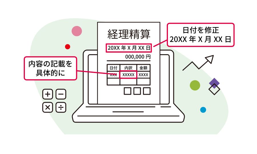 稟議書、出張申請書、精算書などに対し、内容確認や修正点をコメントとして記入。